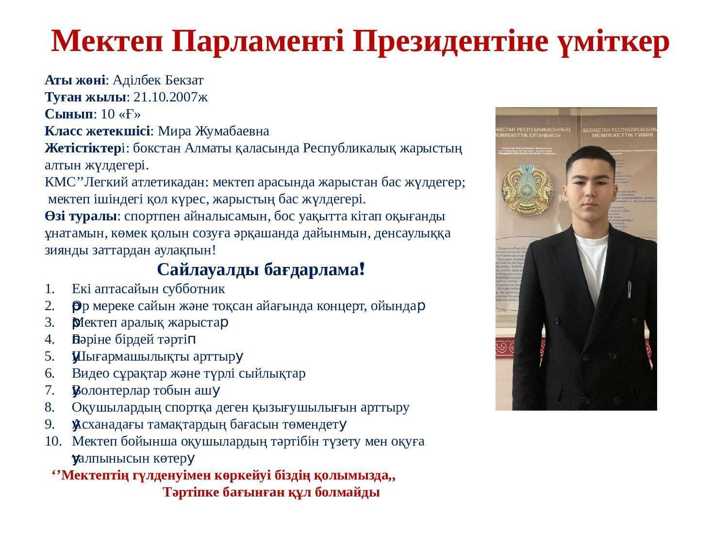 26 сентября в КГУ «ОШ№32» состоятся выборы Президента Школьного Парламента. Кандидаты предоставили свои предвыборные программы