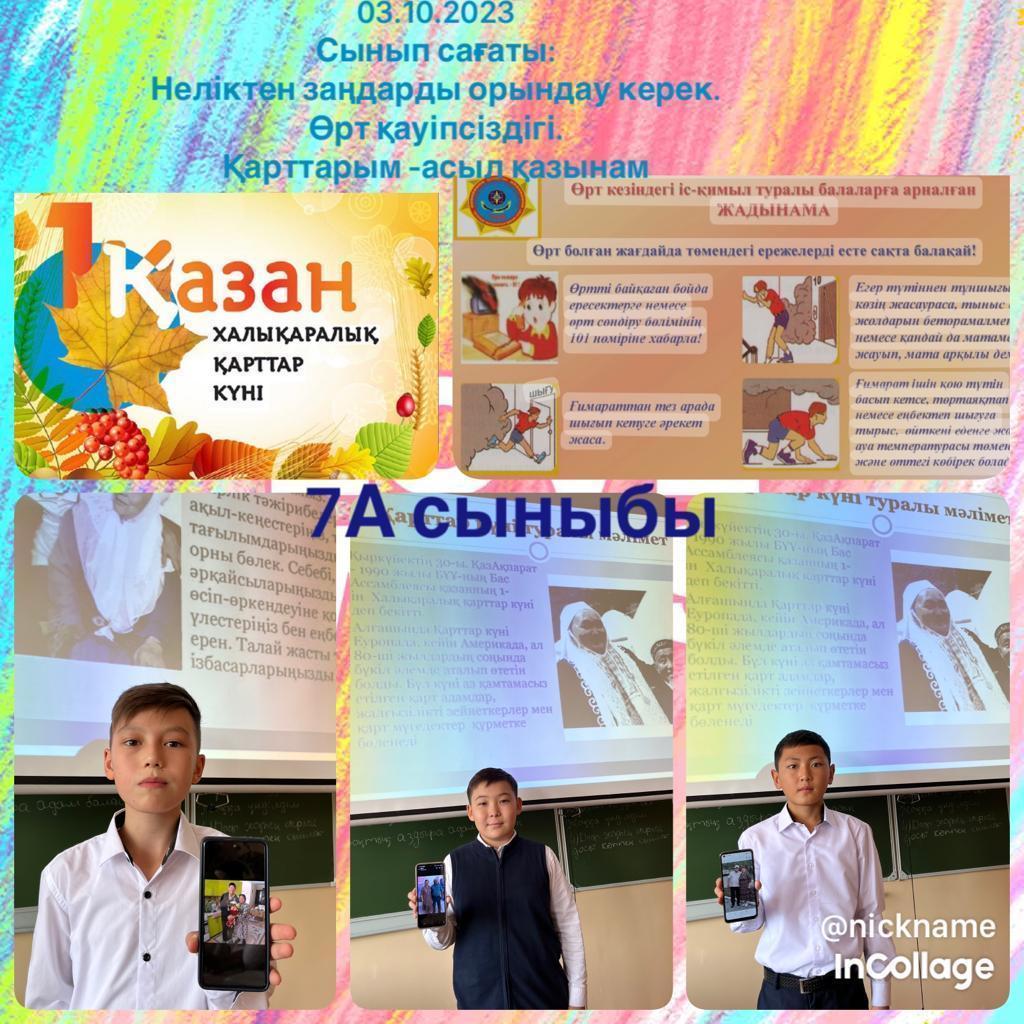 1 сабақта сынып сағаты өтті. Тақырыбы : ЖЖЕ. Өрт қауіпсіздігі / Қарттар күніне арналған «Қамқорлық» акциясы/ 1 уроком прошли классные часы по теме: ПДД. Пожарная безопасность/ Ко дню пожилого человека. Акция «Забота»