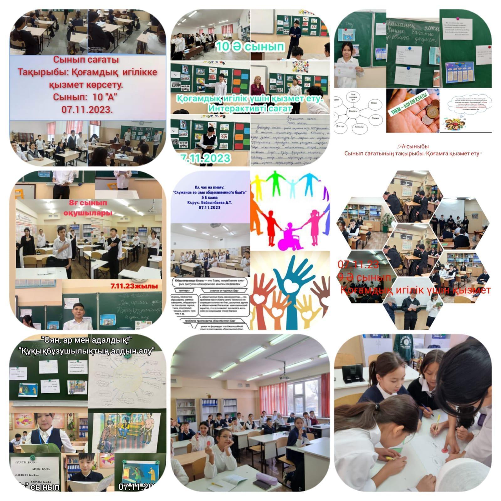 Бүгін 1 сабақта 1-4 сыныптарда "Қоғамдық игілік үшін қызмет ету. Интерактивтісағат\ тақырыбында тәрбие сағаттары өтті.5-11 сыныптарда "Мен – Ұлы даланың баласымын"