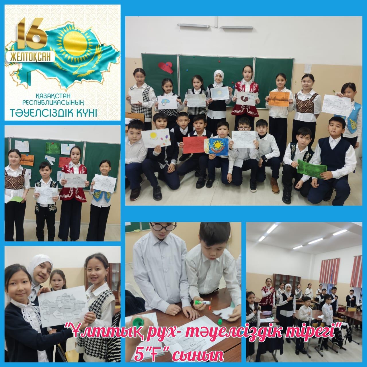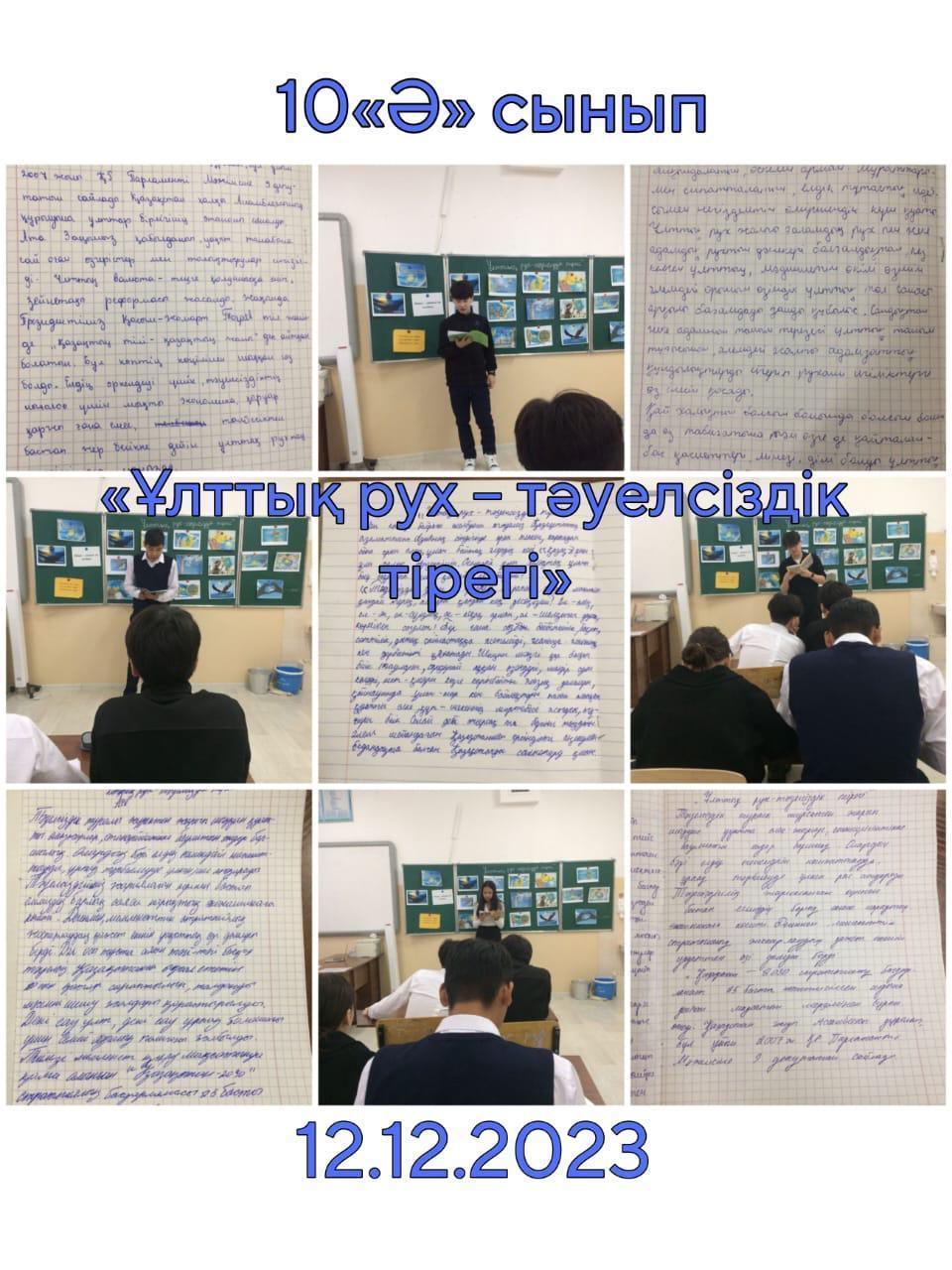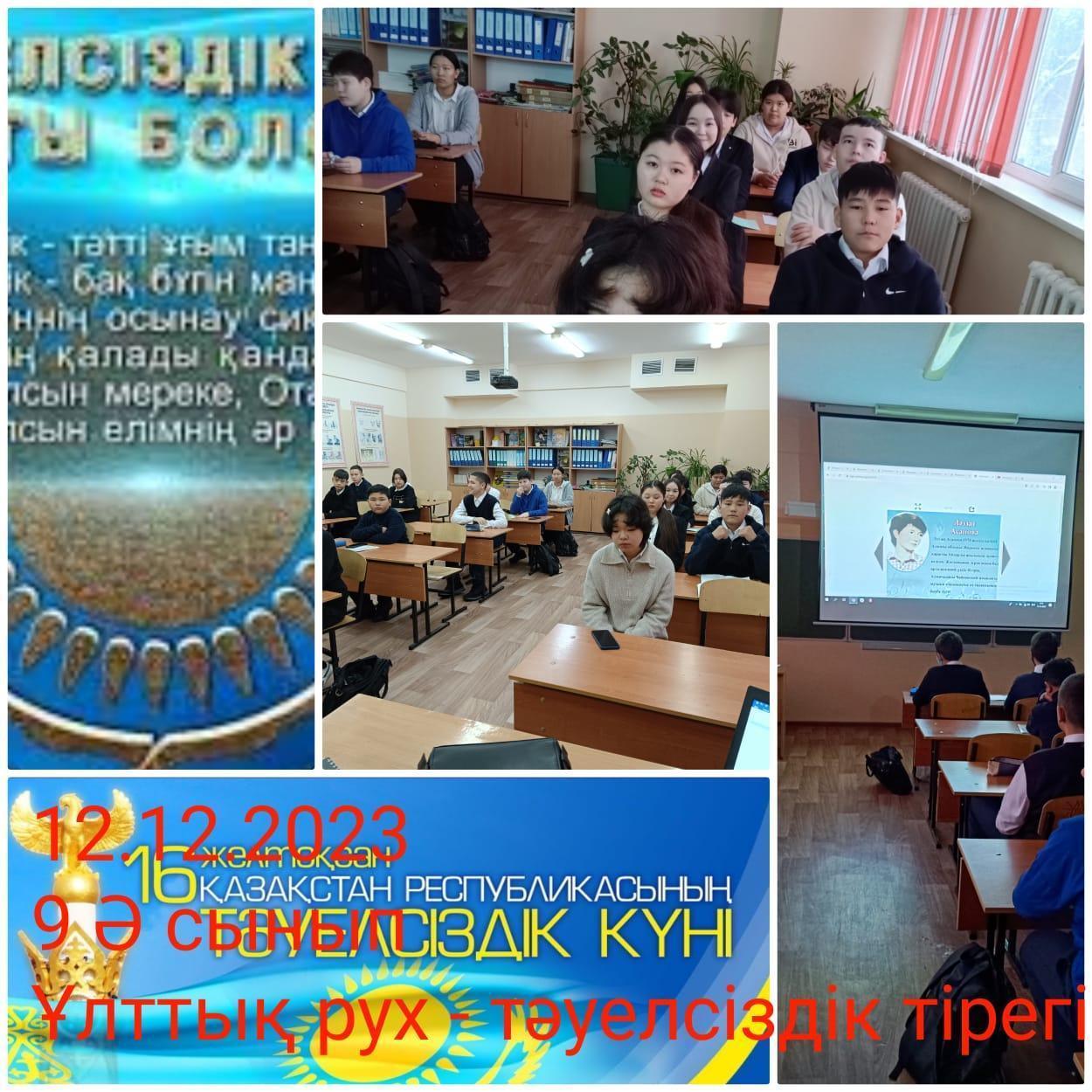 Сегодня, 12 декабря, в 1-11 классах прошли классные часы на тему «Национальный дух – опора Независимости".Цель: воспитывать любовь к своей стране, земле, уважение к Родине, искренность. Демонстрация подвига наших предков на пути обретения независимости нашей страны, показ учащимся декабрьских жертв, пример подвига старших братьев и сестер, принявших участие в декабрьских событиях.Воспитывать у учащихся любовь, чувства к родному краю.