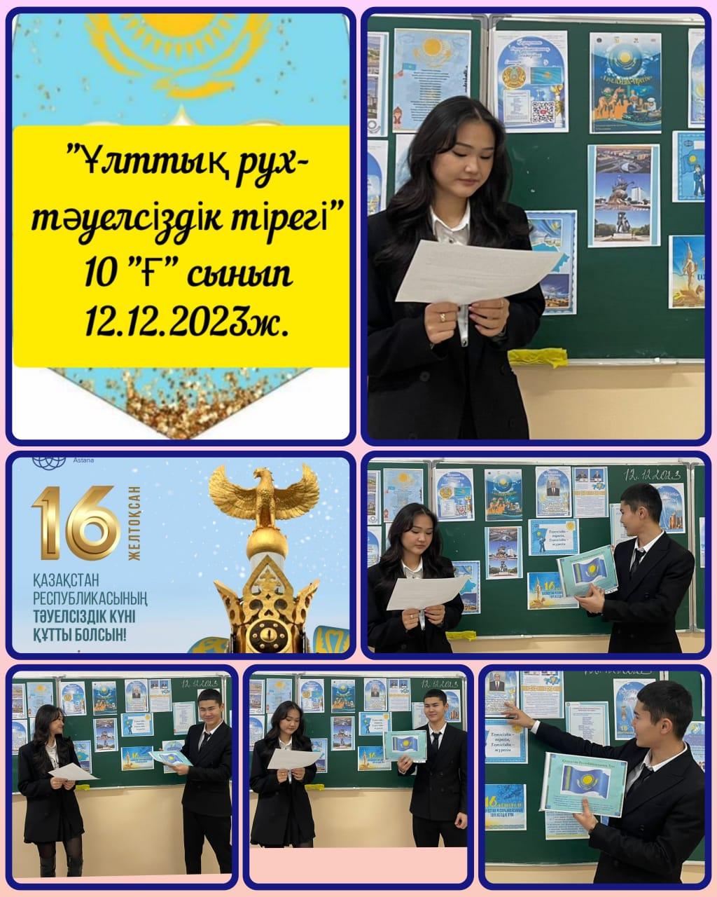 Бүгін 12 желтоқсан 1-11 сыныптарда «Ұлттық рух – тәуелсіздік тірегі" тақырыбында тәрбие сағаттары өтті.Мақсаты: Елін, жерін сүюге, Отанын қастерлеуге, шыншылдыққа тәрбиелеу. Еліміздің тәуелсіздік алу жолындағы ата-бабаларымыздың ерлігін паш ету, оқушыларға желтоқсан құрбандарымен, желтоқсан оқиғасына қатысқан аға-апалардың ерлігін үлгі етіп көрсету.Оқушылардың туған өлкемізге деген сүйіспеншілігін, сезімдерін ояту.