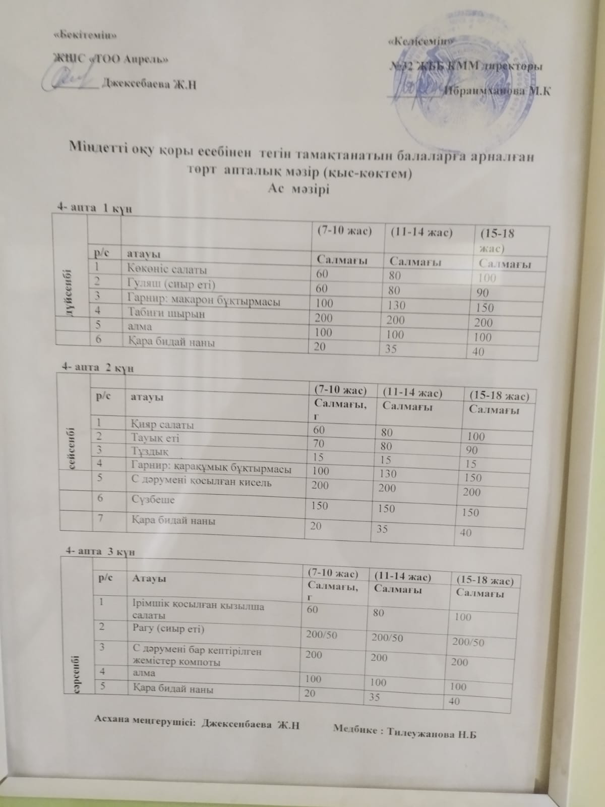 КММ №32ЖББМ-тің оқушыларға тегін тамақтануға арналған тағам мәзірі,4апта.Меню блюд для организаций бесплатного питания обучающихся В КГУ ОШ №32 4-неделя