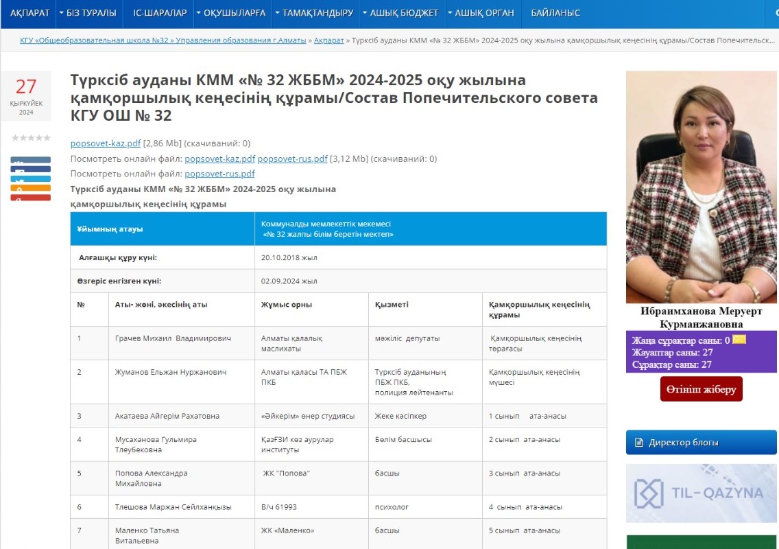 Түрксіб ауданы КММ «№ 32 ЖББМ» 2024-2025 оқу жылына қамқоршылық кеңесінің құрамы/Состав Попечительского совета КГУ ОШ № 32