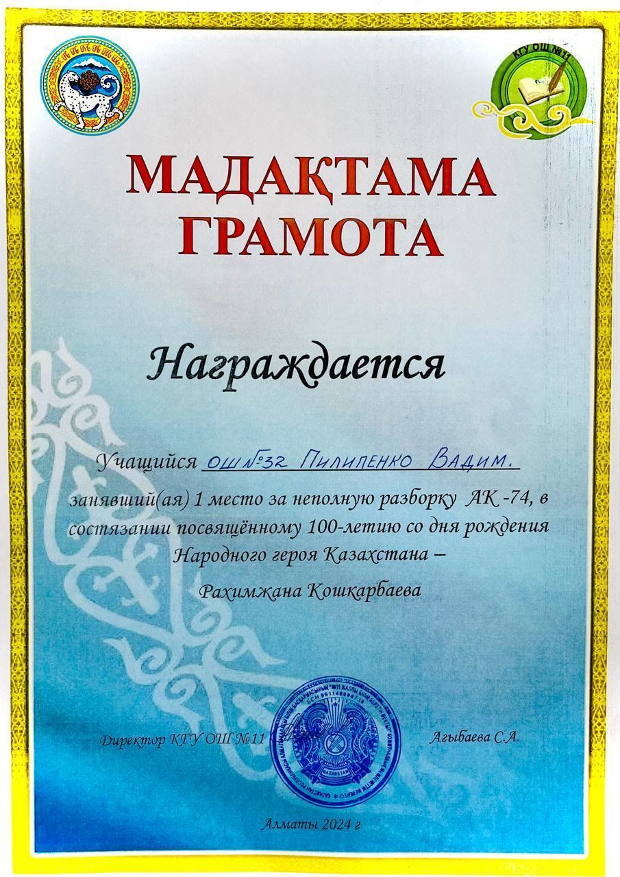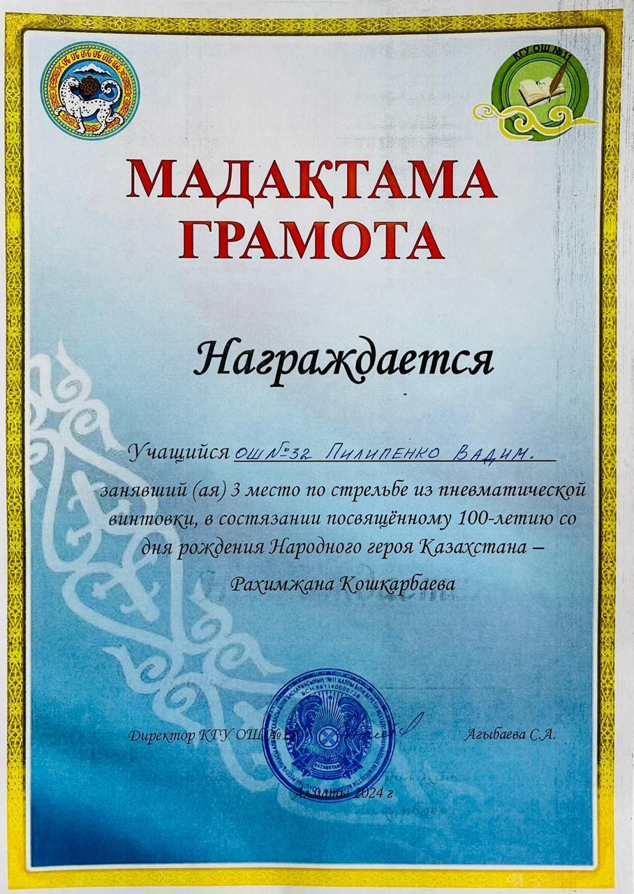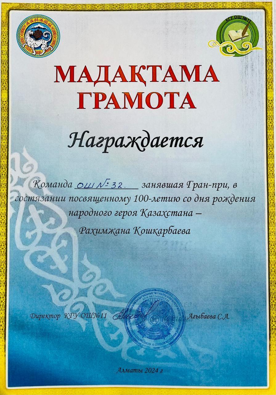 Учащиеся нашей школы , члены военно- патриотического клуба "Батыр" заняли Гран При на состязаниях посвященному 100-летию народного героя Казахстана Рахимжана Кошкарбаева.