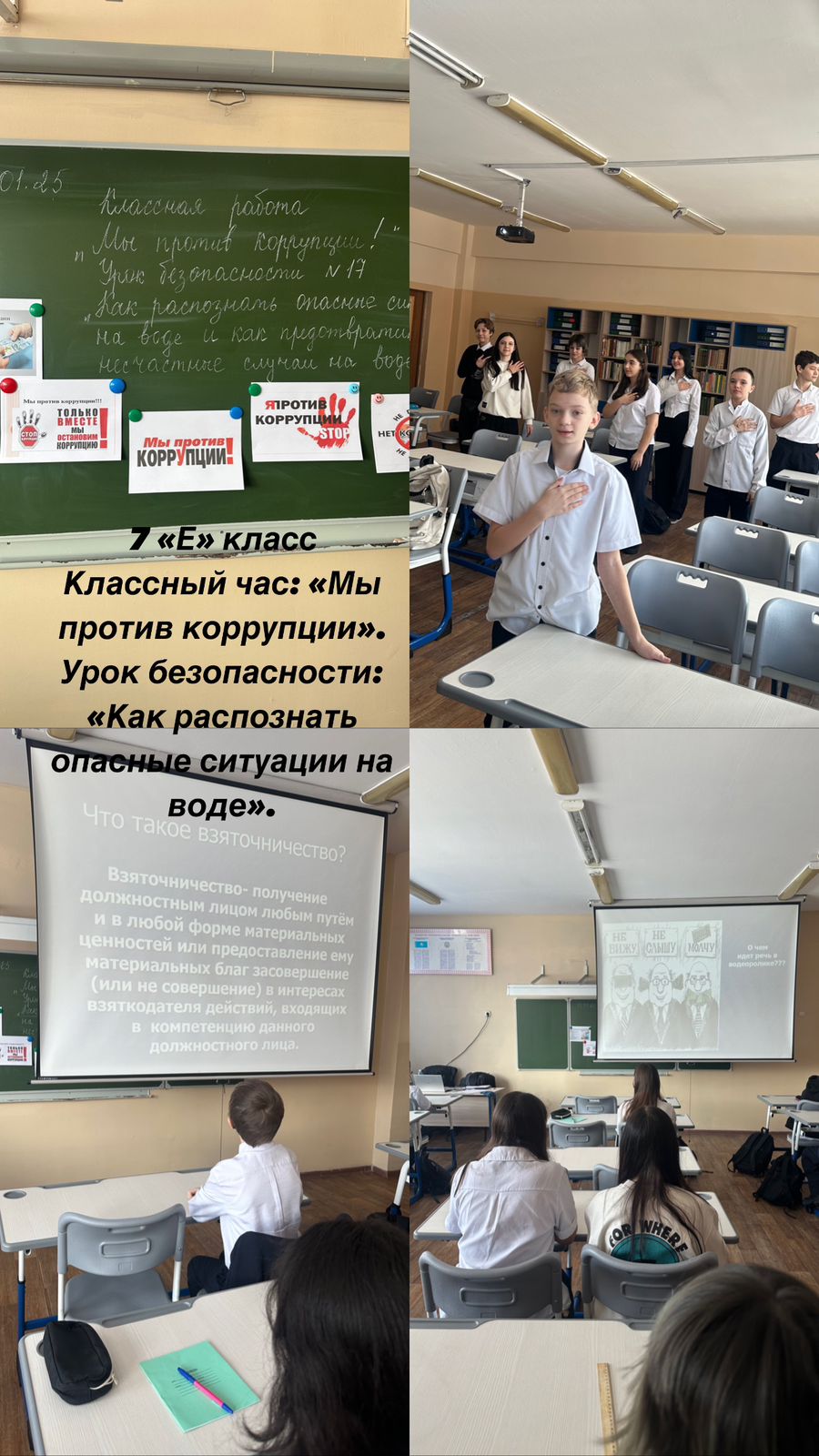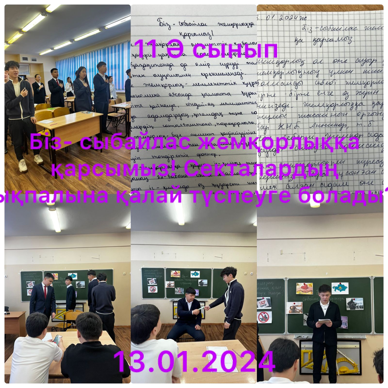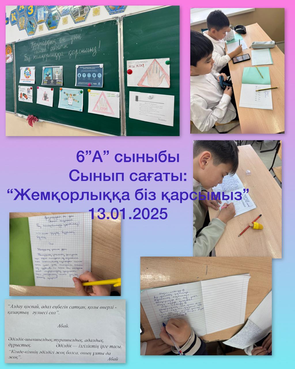 13 қаңтар 2025 0 1 2 3 4 5 Сынып сағаты\Классные часы Бүгін 1 сабақта 5-11 сыныптар "Біз сыбайлас жемқорлыққа қарсымыз" тақырыбында, бастауыш сыныптарда бірлік, адалдық тақырыбында сынып сағаттары өткізілді.Сегодня 1 уроком прошли классные часы по теме 5-11 классы "Мы против коррупции" , в начальной школе по теме единство , честность.