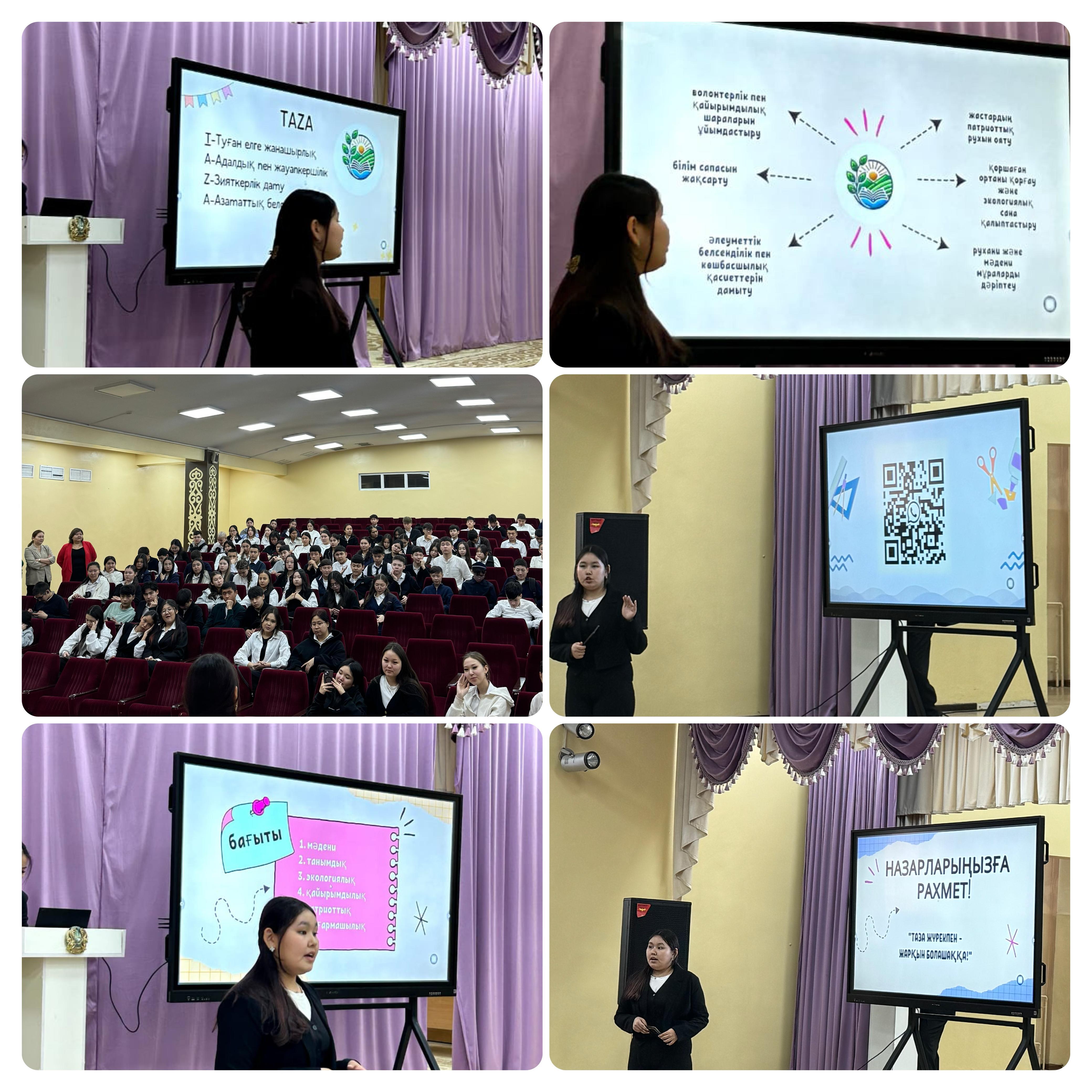 Ученица 9 класса Калдыбай Маржан пригласила учеников 8--11 классов стать членами проекта "TAZA".Главная цель проекта-активизация работы по самоуправлению.Маржан объяснил цели и задачи проекта.