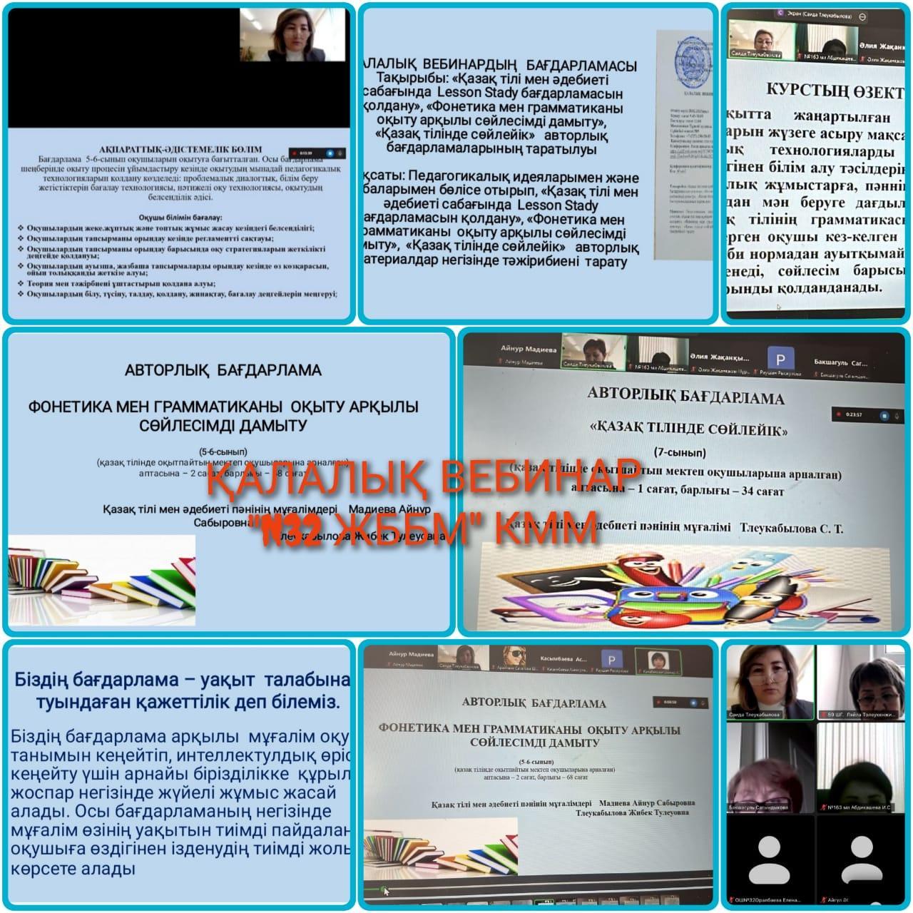 Қалалық білім берудегі жаңа технологиялардың ғылыми-әдістемелік орталығы 2025 жылдың 28 ақпанында орта білім беру ұйымдарының қазақ тілі мен әдебиеті пәні мұғалімдеріне «Фонетика мен грамматиканы оқыту арқылы сөйлесімді дамыту», «Қазақ тілінде сөйлейік» авторлық бағдарламаларының таратылуы мақсатында қалалық вебинар өткізді.Вебинарды ұйыдастырған №32 ЖББМ қазақ тілі және әдебиеті пәні мұғалімдері Тлеукабылова Ж.Т., Мадиева А.С., Тлеукабылова С.Т.