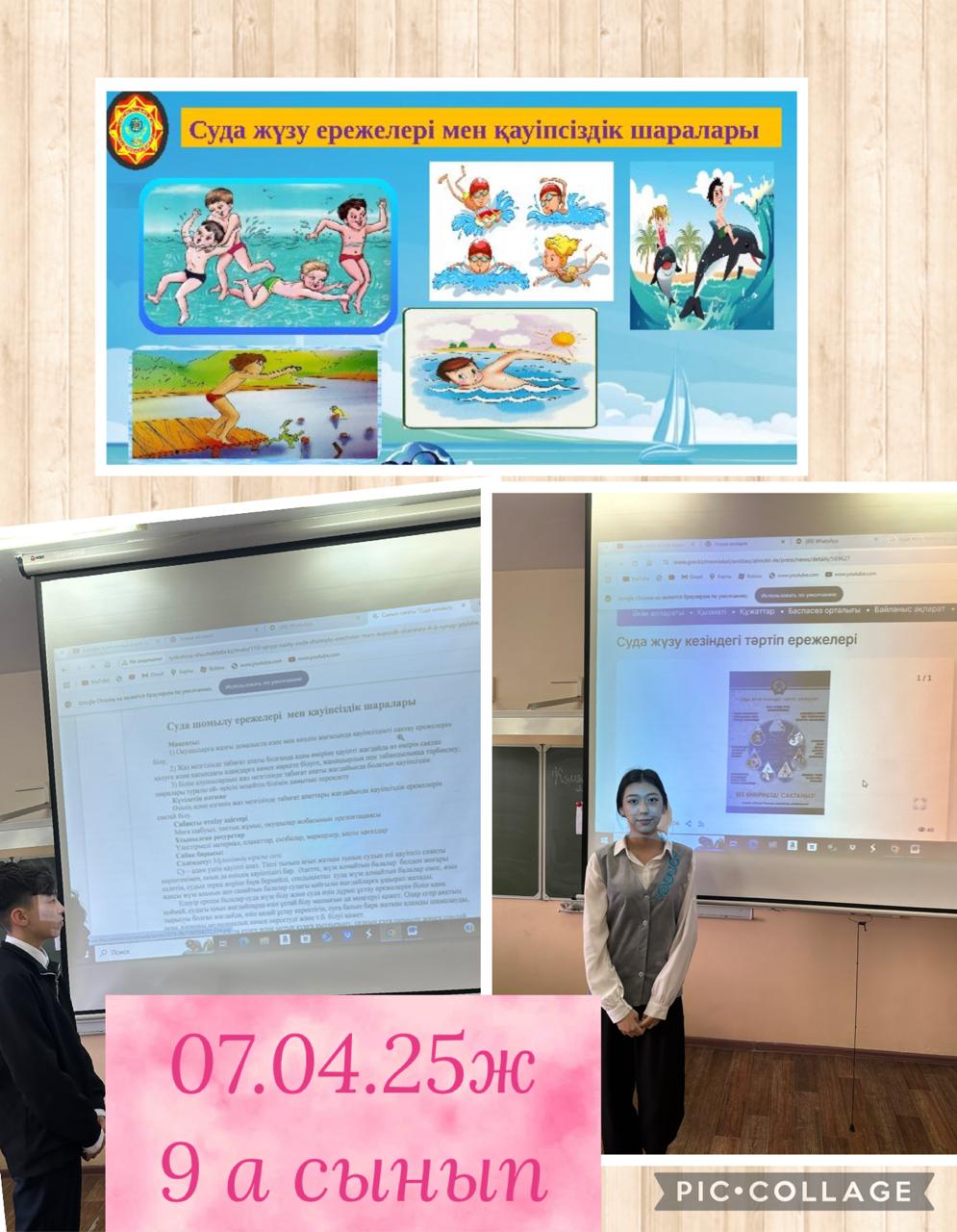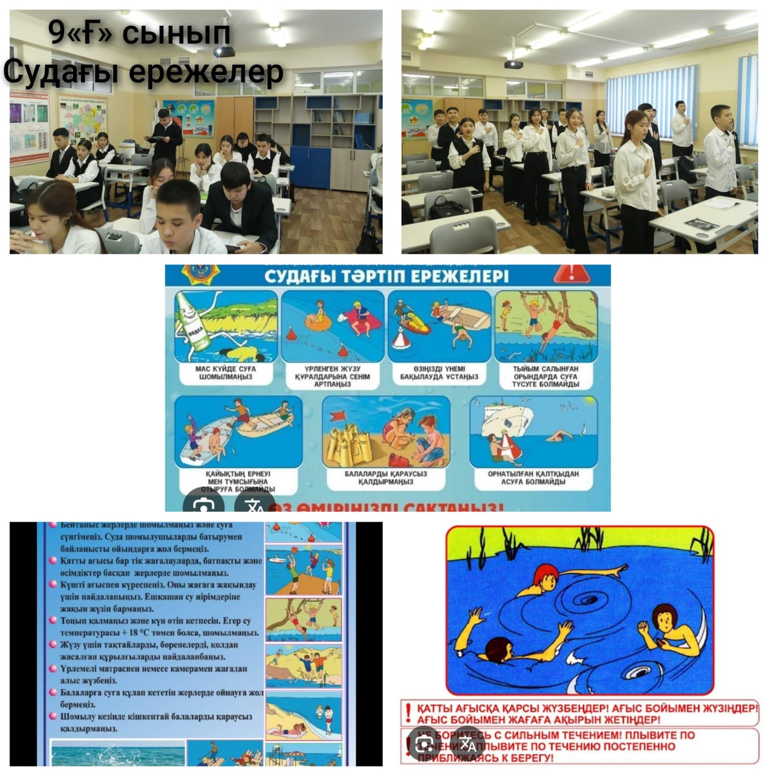 07.04.2025 ж. 1-11 сыныптар арасында "Судағы қауіпсіздік" бойынша нұсқаулық өткізілді. Судағы қауіпсіздік - бұл судағы адамдардың өмірі мен денсаулығын қорғау мақсатында қабылданатын судағы қауіпсіздік шаралары мен ережелерінің жиынтығы. Судағы қауіпсіздік келесі аспектілерді қамтиды: