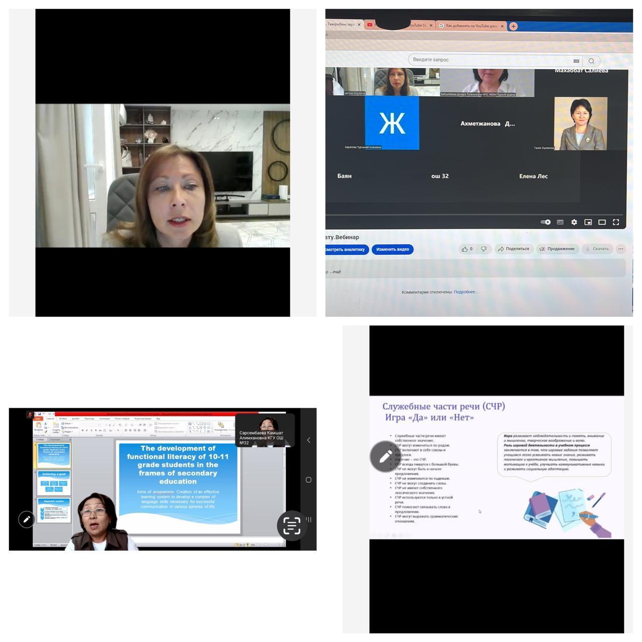 08 сәуірде №32 ЖББМ ағылшын және орыс тілі пәні мұғалімдері Салиева М.Т., Синюкова Л.Н. Сәрсембаева К.А. Байсынбаева Д.Т. онлайн вебинары өтті.Вебинар тақырыбы: "The development of functional literacy of 10-11 grade students in the framework of secondary school" педагог-зерттеуші Сарсембаева К.А. және "Development of students language skills"ағылшын тілі мұғалімдері Салиева М.Т. және Синюкова Л.Н. "Морфология"Орфография" тақырыбы бойынша әдістемелік ұсыным 5-11 сынып оқушыларына арналған орыс тілі мен әдебиеті пәнінің мұғалімі Байсынбаева Д.Т авторлық бағдарлама таныстырылымы болды.