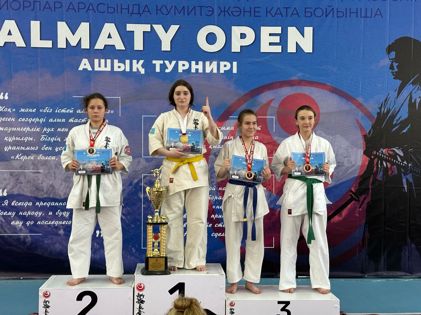 Двенадцатого апреля прошел турнир “ALMATY OPEN” по шинкиокушинкай каратэ посвящённый памяти Динмухаммеда Кунаева в дисциплине «КУМИТЭ» Ученица 8-го «Б» класса Азиева Исмира заняла первое место. В возрастной категории 12-13 лет, в абсолютной весовой категории.