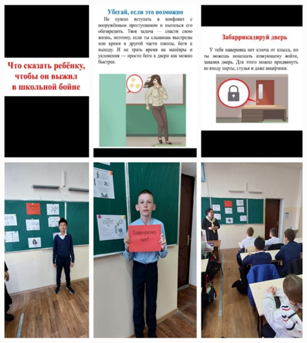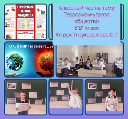 Терроризм және оның салдары" сынып сағаттары өткізілді және осы тақырыптардың барлығы ҚР БҒМ 117 бұйрығына сәйкес сыныптарға бөлінді .