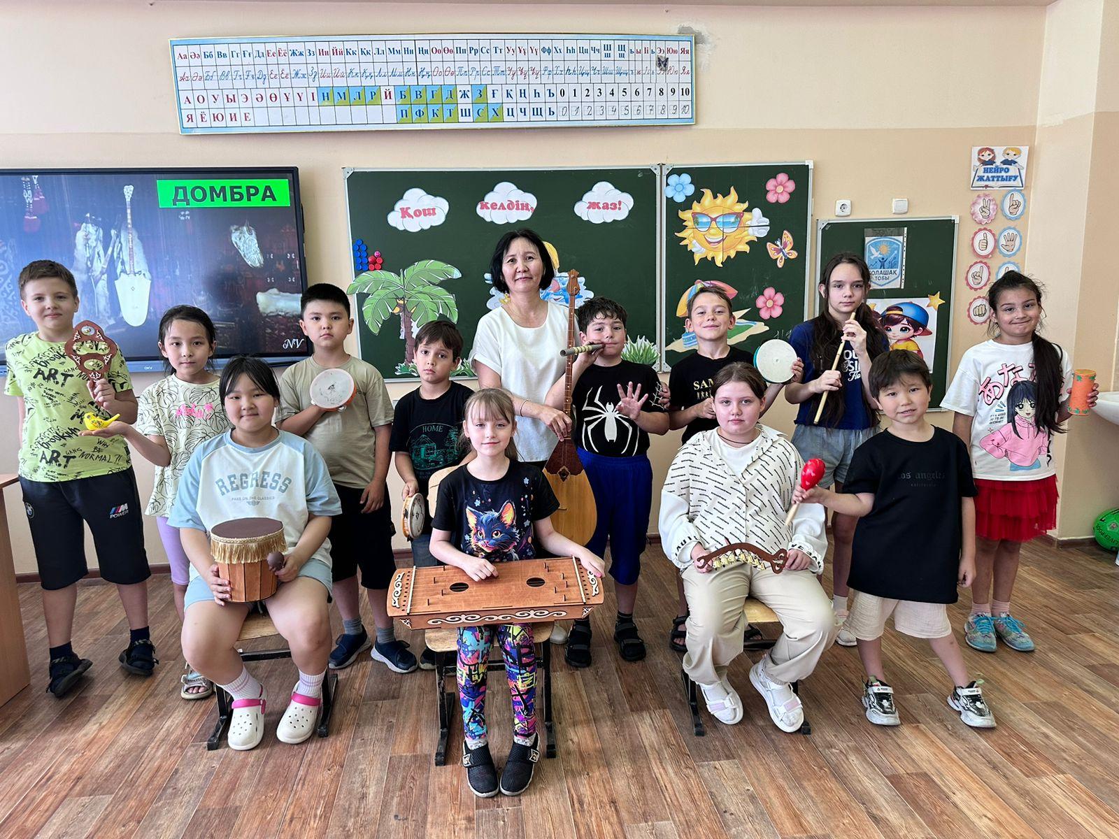 Оқушылардың ұлттық аспаптар туралы білімдерін жетілдіру мақсатында және музыканы құрметтеуге тәрбиелеу үшін жазғы лагерьде "Ұлттық аспаптар" атты сабақ өтті.