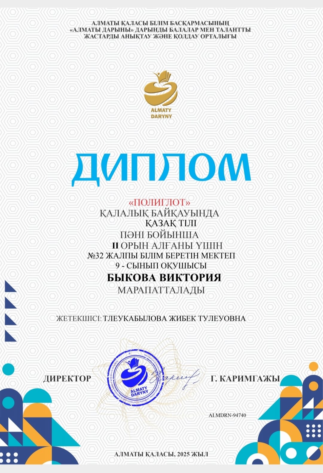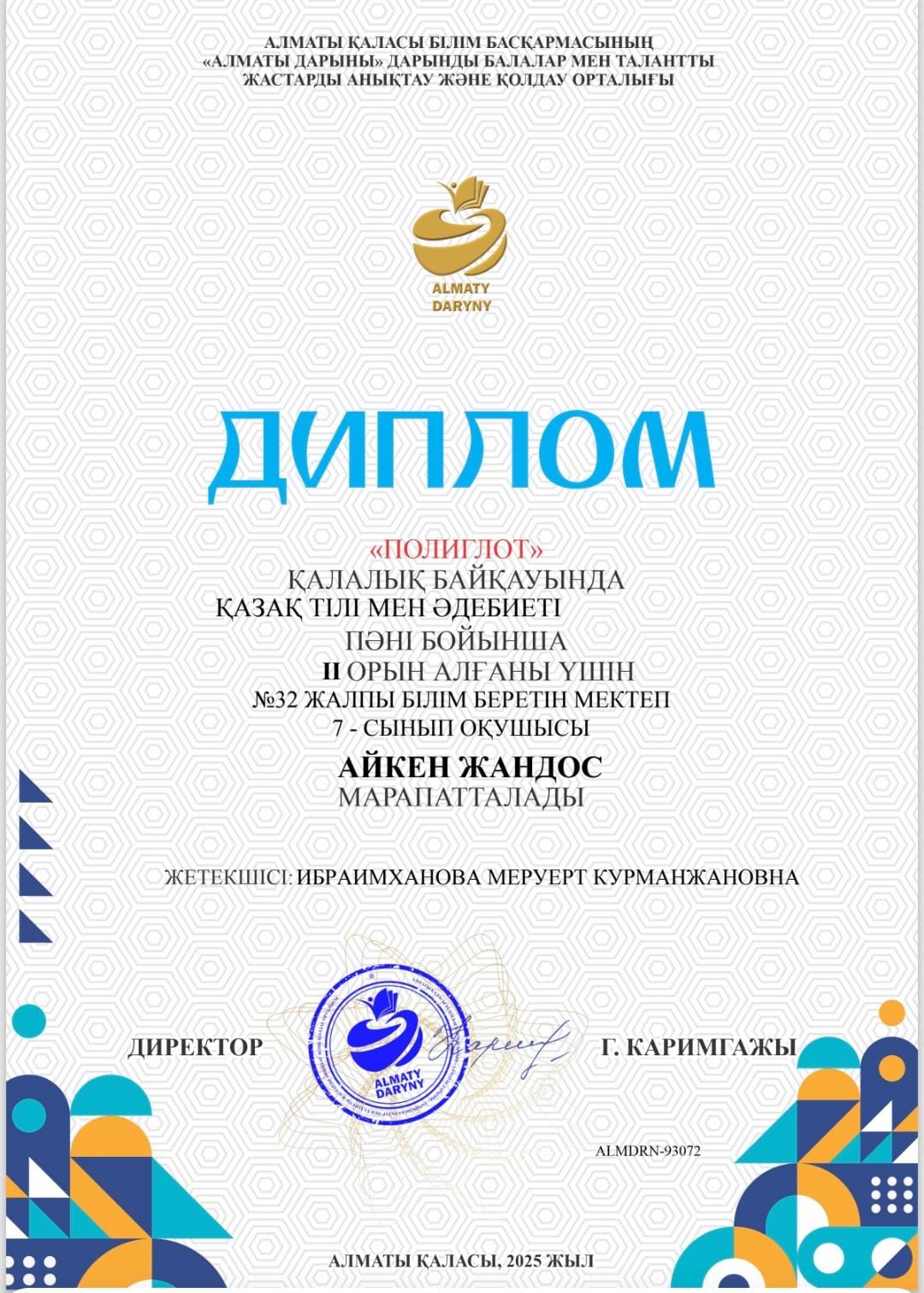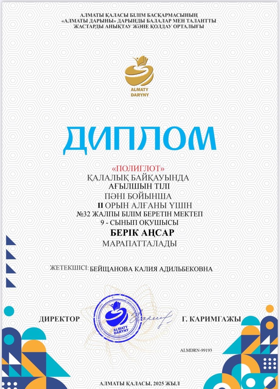 Мектебіміздің ұстаздары "Алматы дарыны" ұйымдастырған "Полиглот" қалалық олимпиадасына қатысты.Оқушылар 1-3 орын алғаны үшін дипломдармен марапатталды.