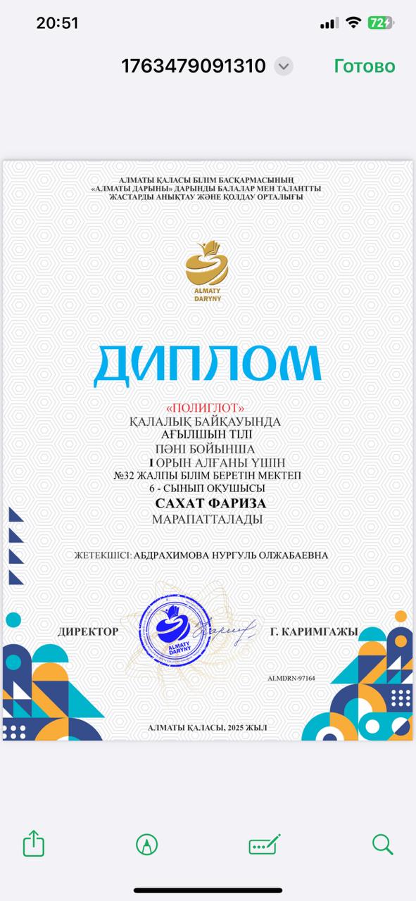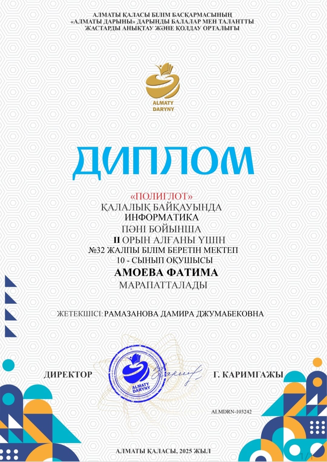 Учителя нашей школы приняли участие в городской олимпиаде "Полиглот""организованный "Алматы дарыны".Учащиеся награждены дипломами за занятое 1-3 места.