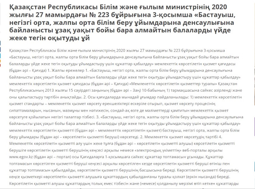 Қазақстан Республикасы Білім жəне ғылым министрінің 2020 жылғы 27 мамырдағы № 223 бұйрығына 3-қосымша «Бастауыш, негізгі орта, жалпы орта білім беру ұйымдарына денсаулығына байланысты ұзақ уақыт бойы бара алмайтын балаларды үйде жеке тегін оқытуды ұйымдастыру үшін құжаттар қабылдау» мемлекеттік көрсетілетін қызмет қағидасы (бұдан əрі – Қағида) 1. Жалпы ережелер 1. «Бастауыш, негізгі орта, жалпы орта білім беру ұйымдарына денсаулығына байланысты ұзақ уақыт бойы бара алмайтын балаларды үйде жеке тегін оқытуды ұйымдастыру үшін құжаттар қабылдау» мемлекеттік көрсетілетін қызмет қағидасы (бұдан əрі – Қағида) «Мемлекеттік көрсетілетін қызметтер туралы» Қазақстан Республикасының 2013 жылғы 15 сəуірдегі заңының (бұдан əрі – Заң) 10-бабының 1) тармақшасына сəйкес əзірленді жəне оны қалыпастыру тəртібін анықтайды. 2. Осы қағидаларда мынадай ұғымдар пайдаланылады: 1) мемлекеттік көрсетілетін қызмет стандарты – мемлекеттік қызмет көрсету ерекшеліктері ескеріле отырып, қызмет көрсету процесінің сипаттамаларын, нысанын, мазмұны мен нəтижесін, сондай-ақ өзге де мəліметтерді қамтитын мемлекеттік қызмет көрсетуге қойылатын негізгі талаптар тізбесі. 3. «Бастауыш, негізгі орта, жалпы орта білім беру ұйымдарына денсаулығына байланысты ұзақ уақыт бойы бара алмайтын балаларды үйде жеке тегін оқытуды ұйымдастыру үшін құжаттар қабылдау» мемлекеттік көрсетілетін қызметті (бұдан əрі – мемлекеттік көрсетілетін қызмет) бастауыш, негізгі орта, жалпы орта білім беру ұйымдары (бұдан əрі – көрсетілетін қызметті беруші) көрсетеді. 2. Мемлекеттік қызмет көрсетудің тəртібі 4. Мемлекеттік көрсетілетін қызметті алу үшін жеке тұлға (бұдан əрі – көрсетілетін қызметті алушы) көрсетілетін қызметті берушіге көрсетілетін қызметті берушінің кеңсесі арқылы немесе «электрондық үкіметтің» веб-порталы арқылы www.egov.kz (бұдан əрі – портал) осы Қағидаларға 1-қосымшаға сəйкес құжаттар топтамасын ұсынады. Құжаттар топтамасын көрсетілген қызметті беруші кеңсесі арқылы көрсетілген кезде көрсетілетін қызметті беруші өтініш пен құжаттар топтамасын қабылдайды, көрсетілетін қызметті берушінің басшысына береді. Көрсетілетін қызметті берушінің кеңсе қызметкері көрсетілетін қызметті алушыға құжаттардың қабылданғаны туралы қолхат (еркін нысанда) береді. Көрсетілетін қызметті алушы құжаттардың толық емес тізбесін жəне (немесе) қолданылу мерзімі өтіп кеткен құжаттарды ұсынған кезде көрсетілетін қызметті беруші көрсетілген мерзімде өтінішті одан əрі қараудан дəлелді бас тартуды осы Қағидаларға 2-қосымшаға сəйкес нысан бойынша жібереді. 5. «Электрондық үкімет» веб-порталы арқылы жүгінген кезде www.egov.kz көрсетілетін қызметті алушы «Білім беру» бөлімінде электрондық мемлекеттік қызметті таңдауды, электрондық сұрау салу жолдарын толтыруды жəне құжаттар топтамасын бекітуді жүзеге асырады. Көрсетілетін қызметті беруші екі жұмыс күні ішінде көрсетілетін қызметті алушының электрондық сұрау салуын өңдеуді (тексеруді, тіркеуді) жүзеге асырады жəне көрсетілетін қызметті алушының порталдағы «жеке кабинетіне» осы Қағидаларға 3-қосымшаға сəйкес құжаттарды қабылдау туралы хабарламаны жолдайды немесе электрондық құжат нысанында осы 2 Қағидаларға 2-қосымшаға сəйкес өтінішті одан əрі қараудан дəлелді бас тартуды дайындап порталдағы «жеке кабинетіне» жолдайды. Көрсетіле