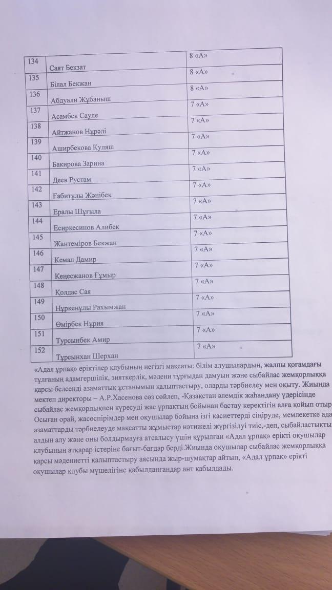 » «Адал ұрпақ» клубы мүшелерінің тізімі/Список членов клуба "Адал Ұрпақ"