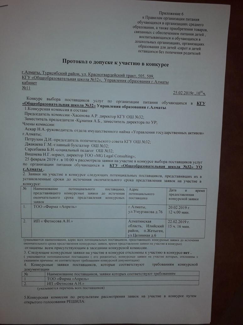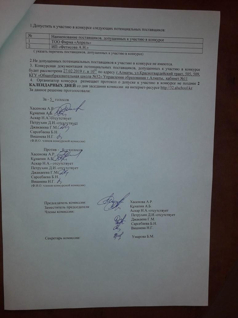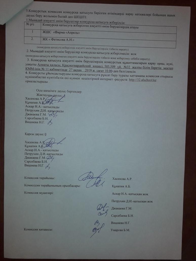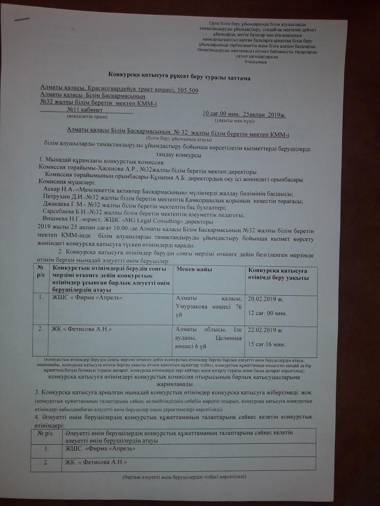 25 ақпан 2019 0 1 2 3 4 5 Конкурсқа қатысуға рұқсат беру туралы хаттама / Протокол о допуске к участию в конкурсе