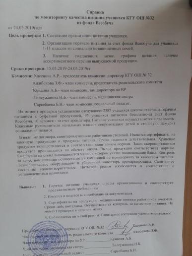 24 мамыр 2019 0 1 2 3 4 5 Мониторинг качества питания учащихся КГУ ОШ №32 из фонда Всеобуча/Жалпы білім беру қорынан № 32 ЖББМ КММ оқушыларының тамақтану сапасының мониторингі