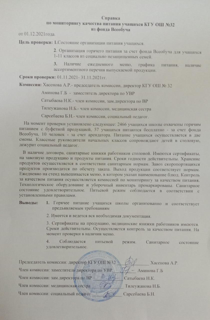 01 желтоқсан 2021 0 1 2 3 4 5 Жалпыға бірдей білім беру қорынан № 32 ЖББМ КММ оқушыларының тамақтану сапасының мониторингі бойынша анықтама Справка по мониторингу качества питания учащихся КГУ ОШ№32 из фонда Всеобуча