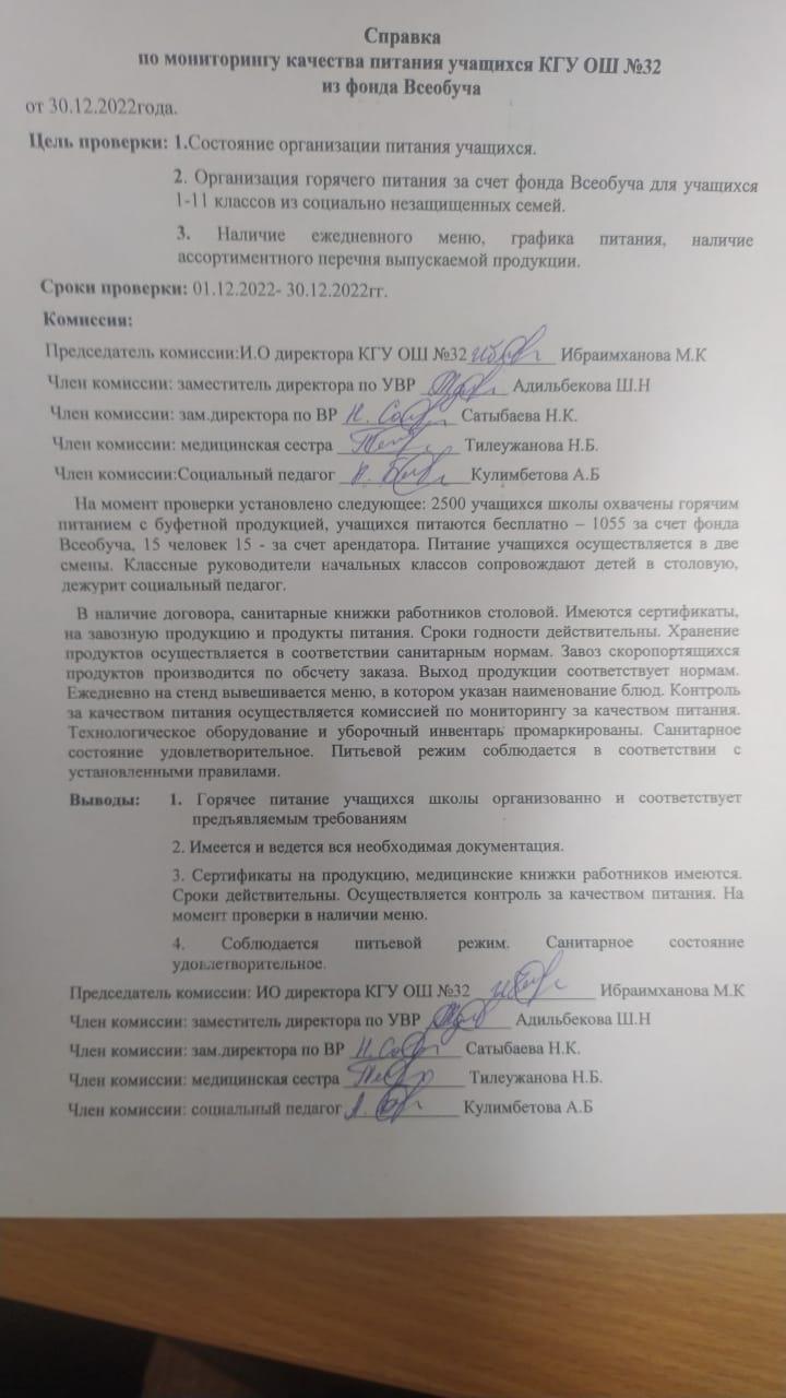 Мониторинг качества питания учащихся КГУ ОШ №32 из фонда Всеобуча/Жалпы білім беру қорынан № 32 ЖББМ КММ оқушыларының тамақтану сапасының мониторингі