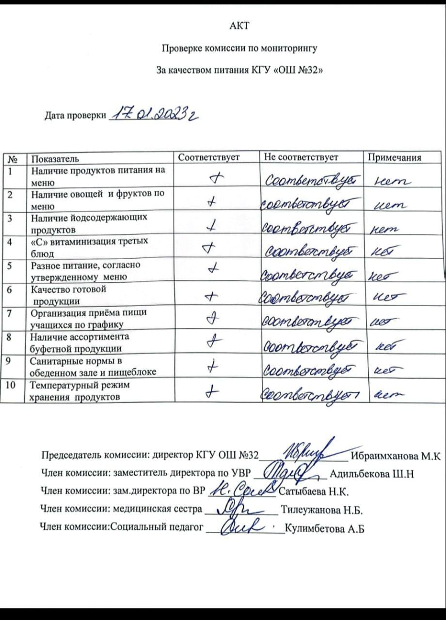 17 қаңтар 2023 0 1 2 3 4 5 АКТ тамақтану сапасына мониторинг жүргізу бойынша комиссия мүшелерінің тексерісі 17.01.2023ж