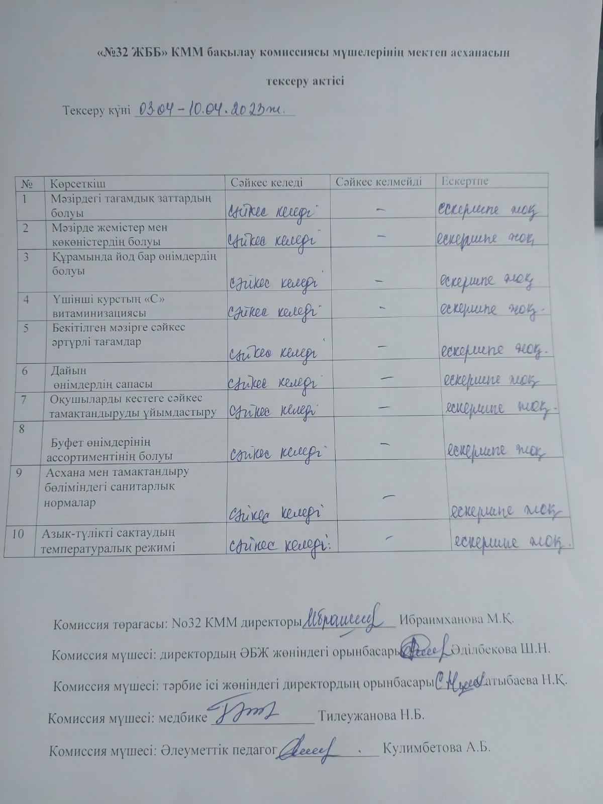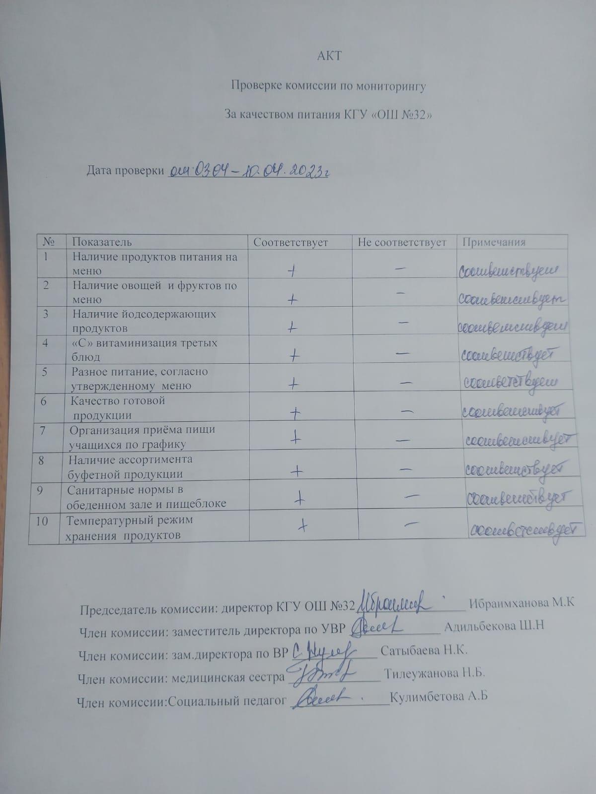 10 сәуір 2023 0 1 2 3 4 5 Бақылау комиссиясы мүшелерінің мектеп асханасын тексеру актісі. АКТ проверки школьной столовой членами комисии по контролю за качеством питания