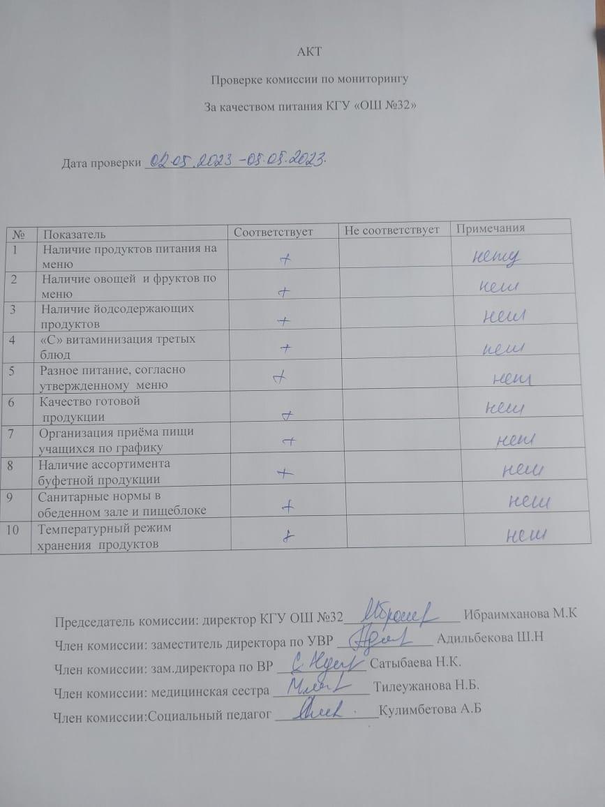 05 мамыр 2023 0 1 2 3 4 5 Бақылау комиссиясы мүшелерінің мектеп асханасын тексеру актісі. АКТ проверки школьной столовой членами комисии по контролю за качеством питания