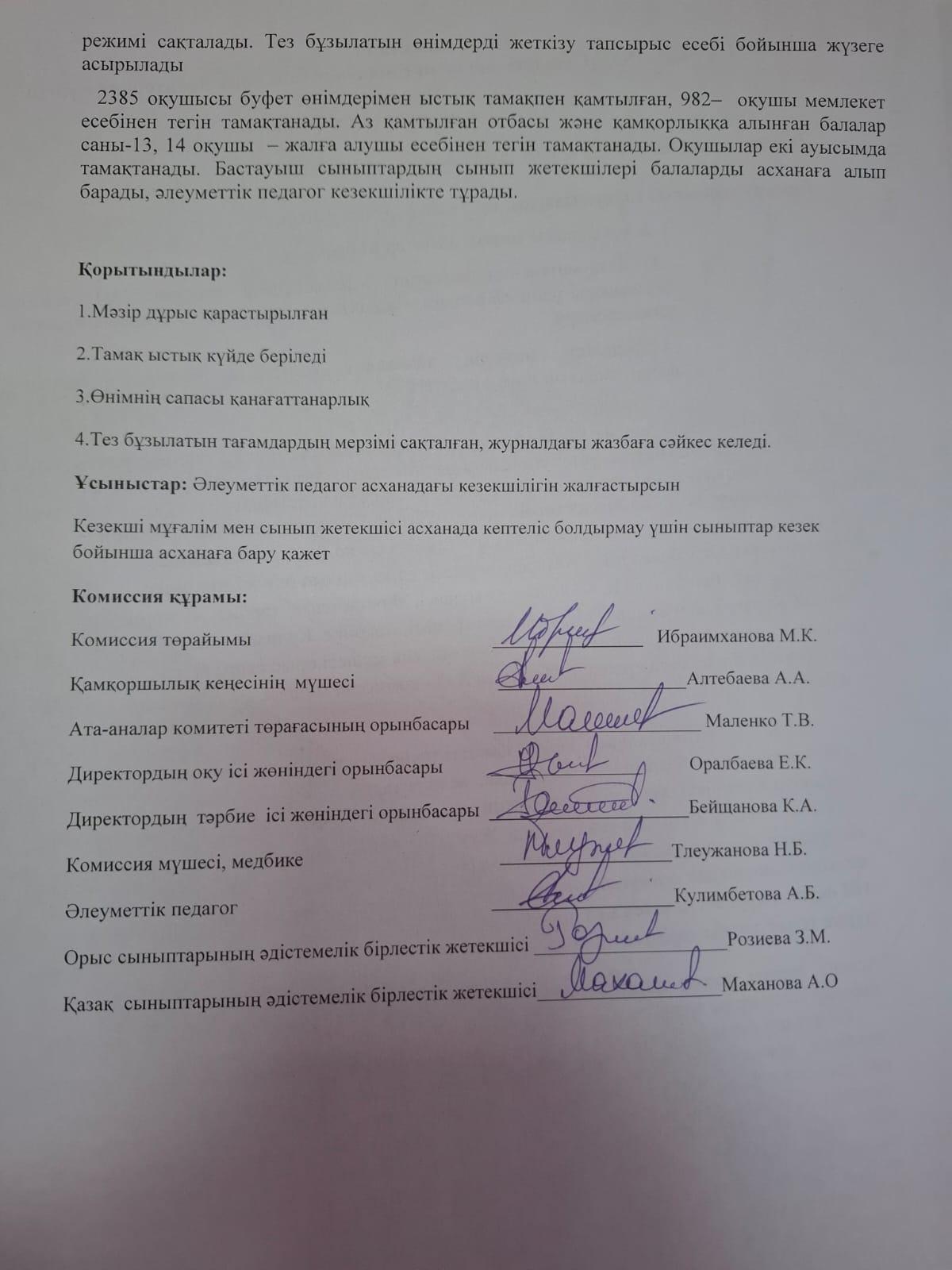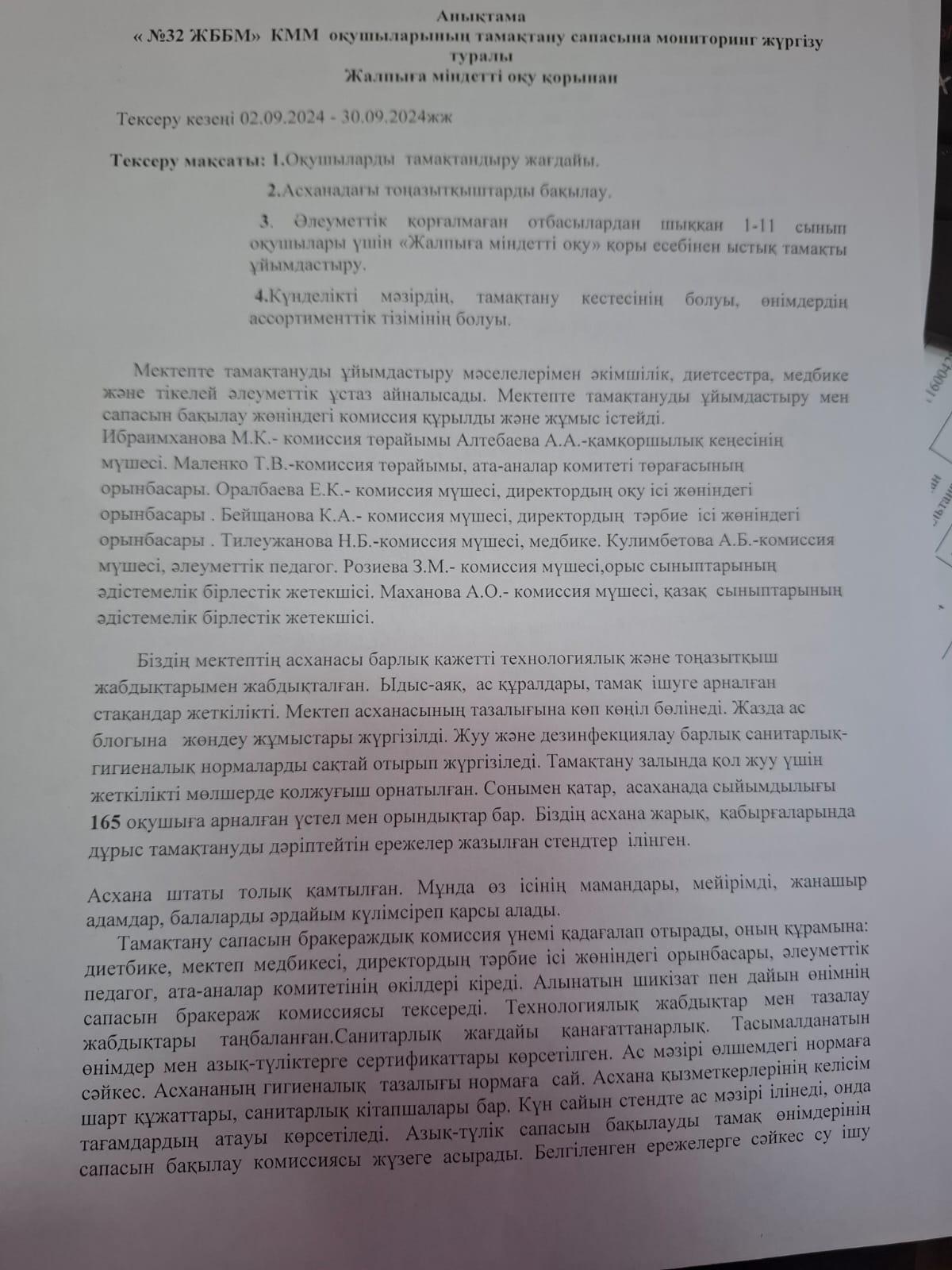 30 қыркүйек 2024 0 1 2 3 4 5 2024 жылдың қыркүйек айындағы № 32 ЖББ КММ үшін тамақтану сапасын бақылау жөніндегі комиссияның есебі. Отчет комиссии по мониторингу качества питания за сентябрь месяц 2024 года по КГУ ОШ №32